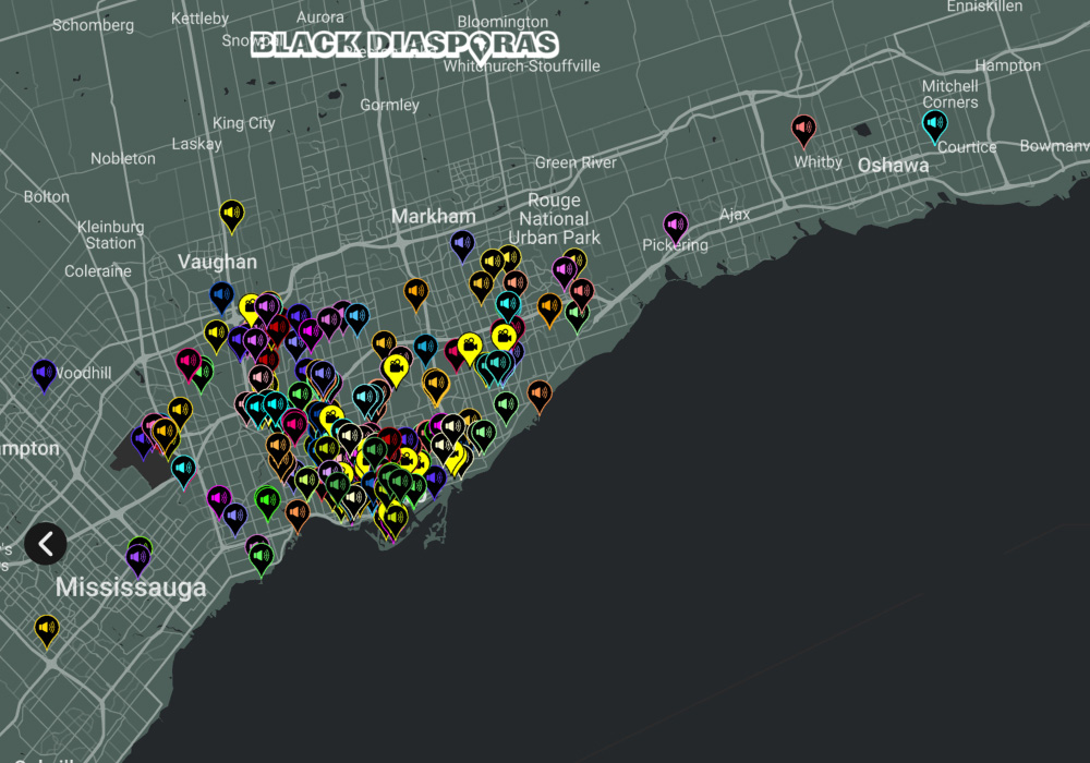 At the heart of Black Diasporas Tkaronto-Toronto is a digital map and physical archive shaped by twelve commissioned short films and more than 500 oral histories. The project references long-standing oral traditions within African and diasporic cultures, centring storytelling as a method of knowledge sharing and community building.